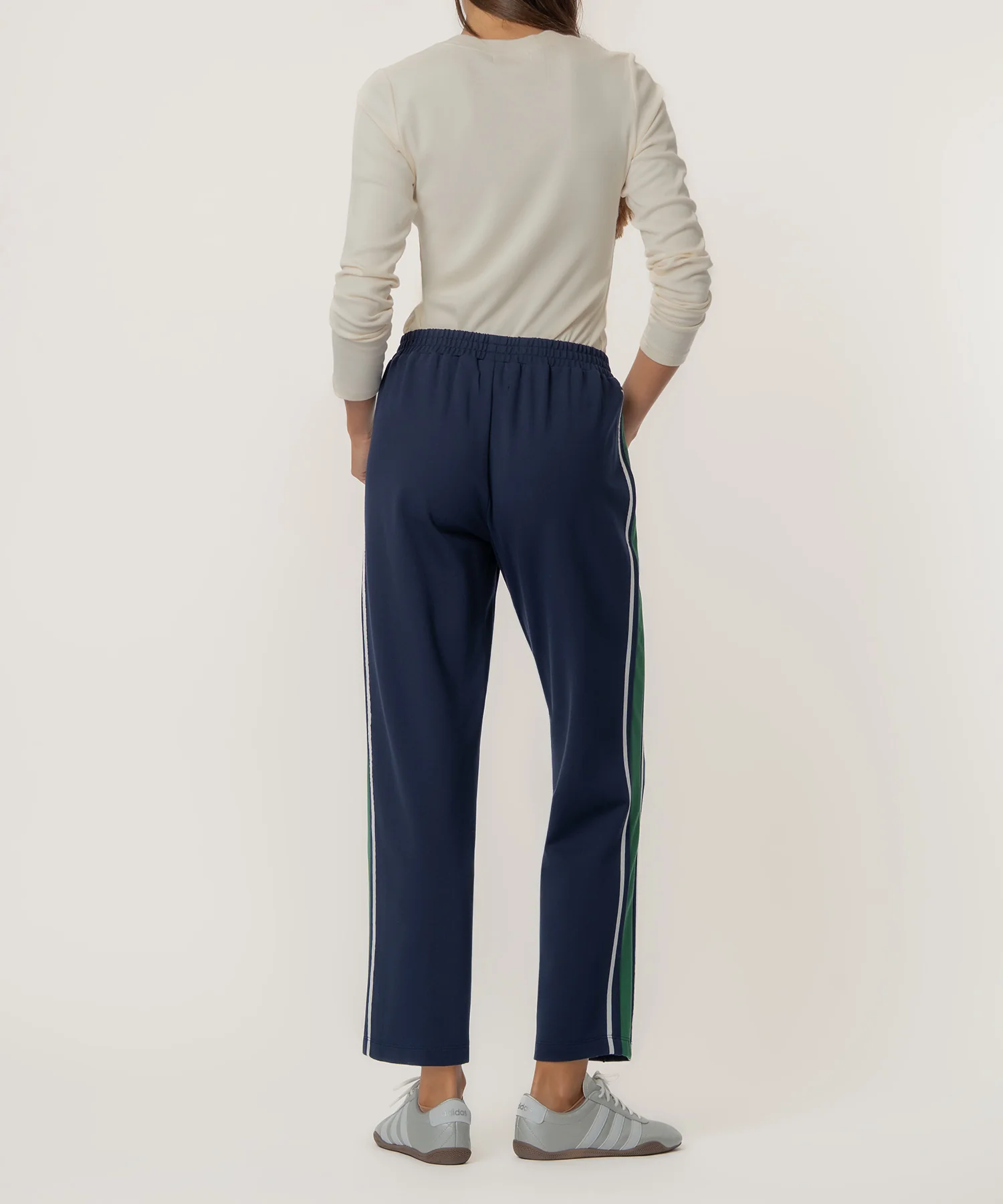- These straight leg pants combine comfort and style with an elastic waist and sleek side seam pockets featuring invisible zippers. Side contrast lines add a modern, sporty edge to the clean silhouette. Perfect for both casual and elevated looks, they’re a versatile wardrobe staple.