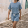 This short sleeve sweatshirt is the perfect lightweight layer made of knit denim french terry. Make it a set with its matching short, or throw it on with linen trousers.